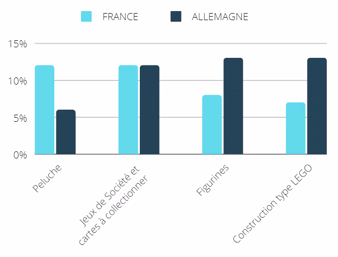 8 des 11 classifications produits du panéliste NPD Group sont en croissance sur 2021. La crise sanitaire a mené les familles à se retrouver autour du “JOUER ENSEMBLE”. Cette tendance se retrouve dans les indicateurs du marché. Les jeux de société / cartes /puzzles, représentant 18% en Allemagne et 19% en France des ventes, sont en hausse. Les jeux de constructions continuent à progresser également :